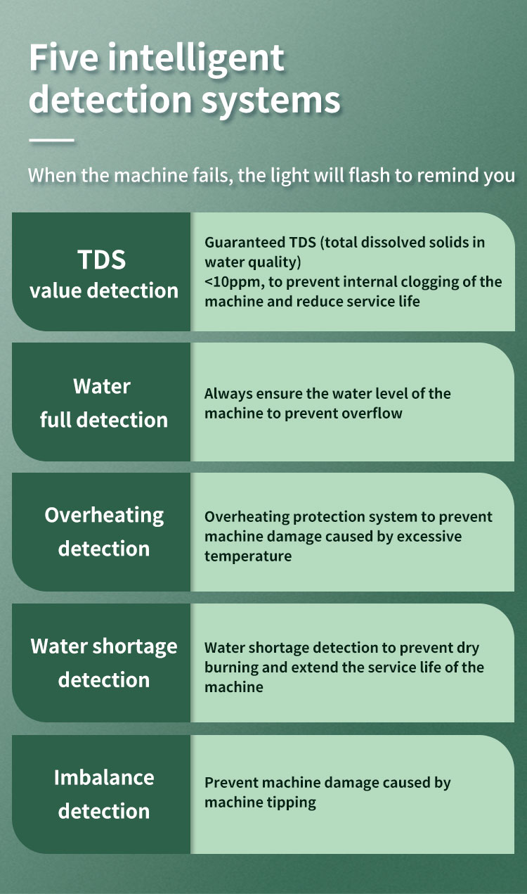 a, TDS detection: ensure that TDS(total dissolved solids in water quality)<5ppm to prevent internal blockage of the machine and reduce the service life